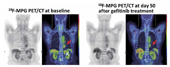 图.非小细胞肺癌患者,分子病理方法检测EGFR突变失败,EGFR突变状态不清。18F-MPG PET/CT检查:60岁女性,无吸烟史,发现肺腺癌。左图为治疗前分子成像:18F-MPG PET/CT检查发现肿瘤SUVmax =3.04,肿瘤大小3.1 × 2.6 cm2(红色箭头)。右图为吉非替尼治疗50天后:18F-MPG PET/CT显示,肿瘤SUVmax 减少至2.61,但仍高于2.23,根据分子影像结果预判该患者仍属于分子靶向治疗优势人群,尚未发生耐药,治疗应该有效,可继续使用分子靶向治疗。经治疗后肿瘤大小缩小至2.3 × 1.3 cm2(红色箭头),验证了分子影像结果预判的准确性。