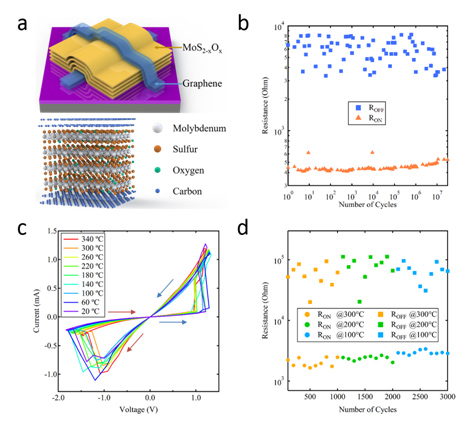 缪峰教授课题组与合作团队利用二维层状硫氧化钼(MoS2-xOx)、石墨烯构成三明治结构的范德华异质结,实现了基于全二维材料的、可耐受超高温和强应力的高鲁棒性忆阻器(如图)。该研究通过制备硫氧化钼和石墨烯薄膜样品,利用二维材料定向转移工艺实现了具有原子级平整度界面的石墨烯-硫氧化钼-石墨烯堆叠的范德华异质结(图a)。测试结果显示这种基于全二维材料的异质结具有很好的非挥发性,并能够实现非常稳定的开关:擦写速度小于100 ns ,可擦写次数超过千万次(图b)。此外,该结构的忆阻器能够在高达340℃的温度下稳定工作,并且保持良好的开关性能(图c,图d),创下了忆阻器工作温度的新记录(此前发表的最高记录为200℃)。置于柔性衬底聚酰亚胺上,在大于0.6%的形变应力下伸曲1200次之后,该忆阻器同样能够稳定工作。