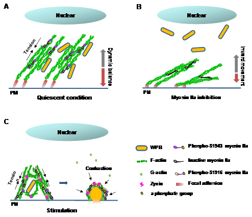 图. 肌球蛋白Myosin IIa调节cAMP诱导的内皮细胞中WP小体分泌的变阻器模式。