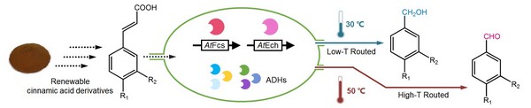 研究团队创新性地将嗜热菌的芳香醛合成酶基因导入中温宿主中,构建了温度导向的全细胞催化体系。在低温时,该催化体系在外源功能酶和内源醇脱氢酶的共同作用下可以将可再生资源阿魏酸转化为香草醇;随着温度的提高,中温宿主内源的醇脱氢酶活性受到抑制,而嗜热菌来源的功能酶活性得以保持,阿魏酸被高效转化为相应的芳香醛香兰素。随后,基于相同的策略,用多种肉桂酸衍生物作为底物合成了相应的芳香醛/芳香醇。这种全新的策略避免了对宿主内源醇脱氢酶敲除的繁琐过程,直接利用温度来控制了芳香醛/芳香醇的合成,极大的简化了生产过程,可以推广至许多其他醛类和以醛类为中间物的化合物的合成,具有重要的现实意义和工业应用价值。