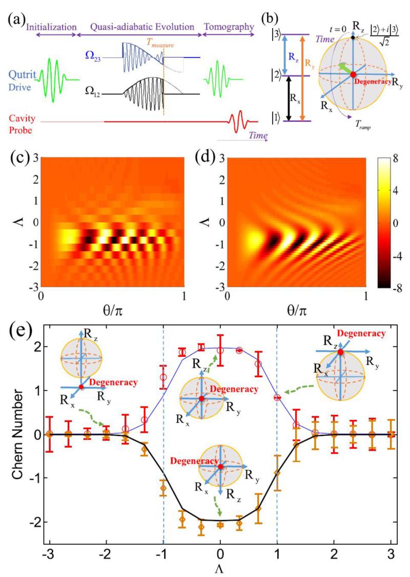 于扬小组通过控制微波频率、强度,对超导量子比特中的四个能级进行了高精度的操控。在此基础上模拟了麦克斯韦金属能带结构,实验模拟到的麦克斯韦金属能带结构见图3,和图2的理论结果高度一致。实验直接探测到了麦克斯韦点,并且在3重简并的麦克斯韦点附近具有线性色散关系的特点也很明显。另外,从理论上也能解释观测到的能谱明亮度的变化特点。特别重要的是,实验直接探测到了包含麦克斯韦点的拓扑不变量,实际测量到的陈数接近±2,这是国际上首次观测到陈数大于1的实验。探测陈数的实验时序、实测的贝里曲率和陈数见图4。其中,实测的陈数在中间区域为±2。从图中也可看出,当改变体系的控制参数从-3到3 时,陈数经历了从0到±2,再到0的变化过程。从而直接验证了参数变化时体系可以实现从拓扑金属到平庸绝缘体的拓扑相变。