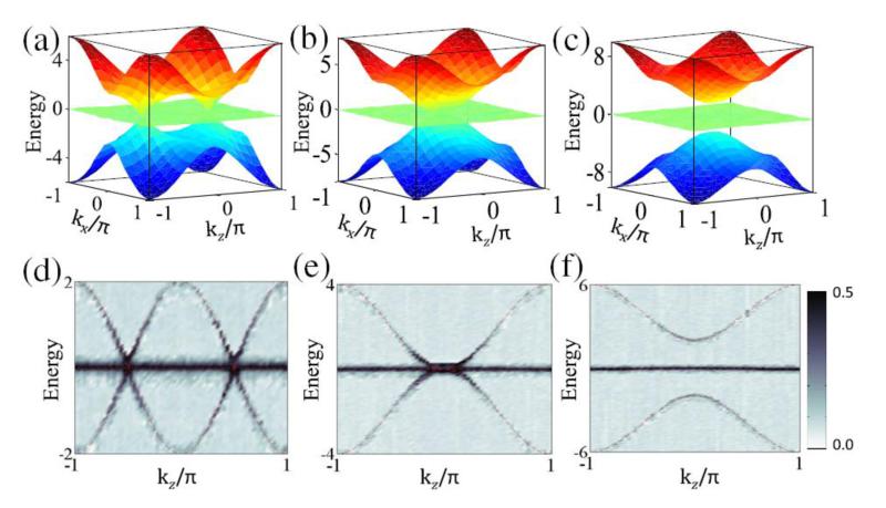 最近朱诗亮小组提出一个具有三重简并的新拓扑金属能带结构,称为麦克斯韦金属[Y.-Q. Zhu et al., Phys. Rev. A 96,033634 (2017)]。该能带结构如图2所示,它具有3带结构,特别是具有3重简并。在该3重简并点的色散关系为线性的,因此相应的准粒子激发可以是(赝)自旋为1的相对性费米子,可以证明要用麦克斯韦方程描述,因此被称为麦克斯韦费米子。该3重简并点也因此被称为麦克斯韦点。由于中间平带的存在,当费米能在麦克斯韦点附近时,体系是金属特性。和通常的狄拉克点和外尔点不同,麦克斯韦点具有非平庸的拓扑陈数2,并且体系具有两条费米弧。随着系统参数的变化,麦克斯韦金属发生拓扑相变,麦克斯韦点可以湮灭,变化到平庸的绝缘体。
