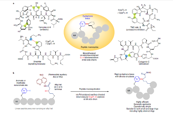 受到环肽天然产物生物合成的启发,陈弓课题组通过金属催化对链状多肽底物上原本非常惰性的烷基碳氢键进行选择性活化,并和带有碘取代的芳香氨基酸侧链进行分子内偶联从而生成各种环状产物。