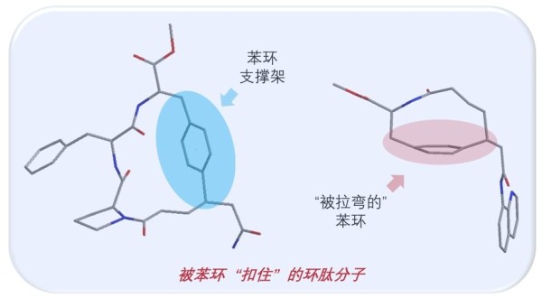 据介绍,这个新的环肽合成方法简洁、高效,底物适用范围广,且能够生成具有独特“苯环支撑架”结构的三维环肽骨架,为构建体积各异的环肽化合物提供了一条通用的途径。令研究人员意外的是,除大环外,具有超高环张力的小环环肽化合物也能通过上述方法高效制备。单晶结构显示,一些作为支撑结构的苯环在环张力作用下发生了罕见的弯曲,从原本的平面结构变成了“类船式”结构。