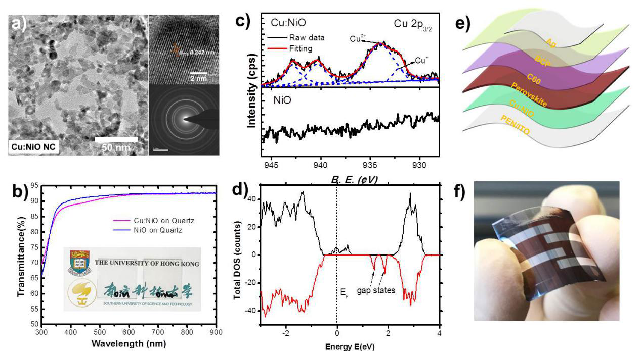 图4. 铜掺杂氧化镍对界面功函的调节以及柔性钙钛矿太阳能电池的成功制备