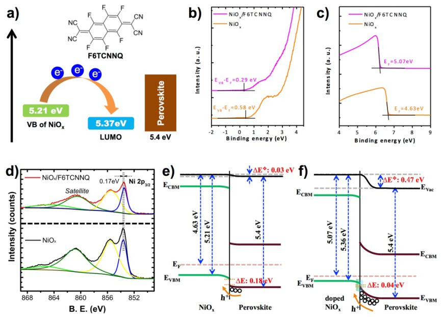 图1. XPS和UPS数据揭示F6TCNNQ分子表面掺杂对NiO能带结构调控及减小钙钛矿电池阳极界面能级失配的作用机制