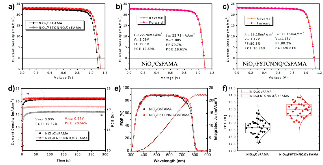 图3.F6TCNNQ表面分子掺杂氧化镍对CsFAMA钙钛矿光伏电池性能的提升。