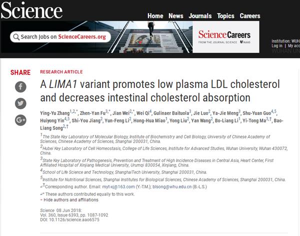 论文题目为A LIMA1 variant promotes low plasma LDL-cholesterol and decreases intestinal cholesterol absorption(《LIMA1基因变异减少小肠胆固醇吸收并降低血浆低密度脂蛋白胆固醇水平》)(doi: 10.1126)。宋保亮和新疆医科大学第一附属医院马依彤教授为共同通讯作者,中国科学院上海生化细胞所张莹钰博士、新疆医科大学第一附属医院付真彦博士、我校生命科学学院魏健博士为共同第一作者。