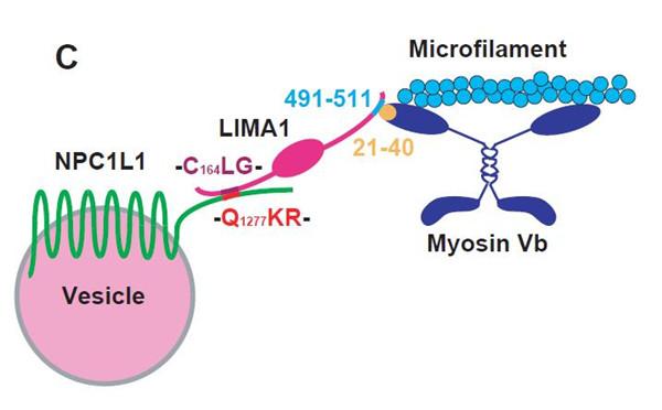 ▲LIMA1蛋白通过结合NPC1L1和Myosin Vb调控小肠胆固醇吸收