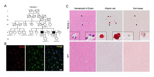 图注:A. MYORG基因突变隐性遗传的家系一; B. 在2月龄小鼠大脑皮层中,Myorg基因与胶质细胞的标记分子S100b共标;C. 在9月龄Myorg基因纯合敲除的小鼠大脑内,钙沉积物染色阳性。