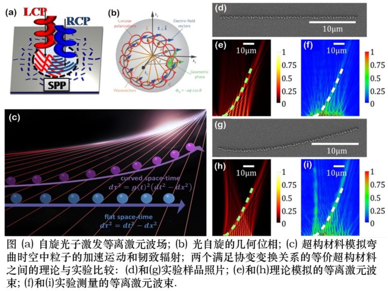 另一方面,光子也是满足量子力学的自旋为1的玻色子,通过引入自旋自由度,人们可以利用光自旋霍尔效应更加灵活地在芯片上调控光子传播。最近,介电体超晶格实验室与香港科技大学Jensen Li课题组合作,将光自旋引入变换光学芯片,通过同时改变超构材料整体的弯曲形状和结构单元局域的旋转角度(图(a)),可以调控时空中自旋光子态的几何位相(图(b)),模拟弯曲时空中粒子的加速运动和韧致辐射(图(c))。课题组博士生仲帆在实验中通过构造伦德勒时空,模拟了黑洞周围加速粒子的韧致辐射,实现了自由空间自旋光子激发芯片上等离激元伦德勒波束的过程(图(d-i))。更进一步,利用不同弯曲时空度规之间广义协变变换,在理论上可以找到了一系列满足等价关系的弯曲超构材料,实验中在不同超构材料中同时产生相同的表面等离激元波场,结果表明广义协变变换为变换光学芯片的设计提供了更加广泛灵活的理论方法。该工作近期发表在“Controlling Surface Plasmons Through Covariant Transformation of the Spin-Dependent Geometric Phase Between Curved Metamaterials”Phys. Rev. Lett. 120,243901 (2018), 博士生仲帆是第一作者, 南京大学是第一单位,祝世宁院士参与了讨论和文章的修改。