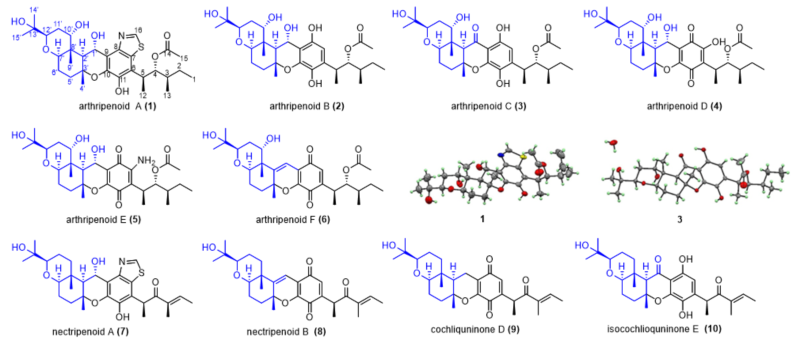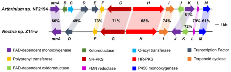 研究表明,真菌的聚酮杂萜是一类结构复杂、活性显著的天然产物,这类化合物在生物合成上的特点是编码聚酮合成酶和萜类合成酶的基因在物理距离上非常相近,往往聚集成簇(基因簇)。利用此特点,研究组从两株真菌Arthrinium sp. NF2194和Nectria sp. Z14-w中分析并鉴定出两个高度同源的杂萜生物合成基因簇(atn和ntn)(图-1A)。为获得这两个基因簇所编码的天然产物,他们利用RT-PCR对不同培养基发酵下两基因簇的表达量进行分析,选择表达量最高的条件进行大规模发酵,最终分离鉴定10个杂萜分子(图-1B),其中名为arthripenoid C的化合物具有较强的免疫抑制活性。