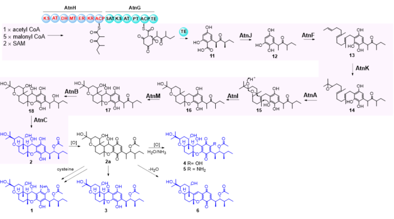 此外,通过对基因簇合成基因的分析,综合分子生物学、生物化学和有机化学等多学科的研究手段,他们完整阐明了此类新型真菌杂萜在生物体内的组装过程。研究表明,这两株真菌所产杂萜的形成有非常相似的生物合成过程,均通过高度还原型聚酮合成酶(HR-PKS)和非还原型聚酮合成酶(NR-PKS)的相互协作合成一链状芳香聚酮;然后通过一黄素依赖的脱羧氧化酶,脱去苯环上的羧基并原位产生羟基;再经法尼基转移酶转入萜链,然后连续的环氧化以及环化形成杂萜分子的共同骨架;此后,经氧化、酮基还原、乙酰化等不同的后修饰过程,构建出结构多样的杂萜分子(图-2)。该项研究,利用了杂萜型天然产物的生物合成特点,实现了该类化合物的高效基因挖掘,其中所展示的方法可推广至其它活性杂萜的发现。