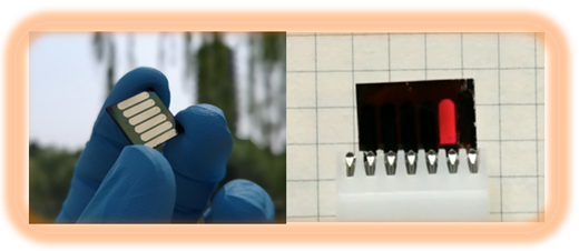 图1. 左:反式结构钙钛矿太阳能电池。右:电池器件在正向电压(2 V)下的发光照片(表明电池器件具有较低的非辐射复合能量损失)。