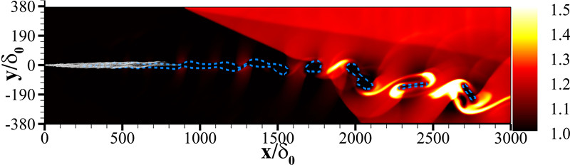 图2斜激波与剪切旋涡相互作用过程中的无量纲温度T/T0与燃料蒸汽质量分数(蓝色虚线YF=0.05)的瞬时分布:(a)弱激波与化学计量混合物(热自燃状态),(b)强激波与化学计量混合物,(c)强激波与富燃混合物(局部近似爆震燃烧状态)。灰色圆点表示燃料液滴。