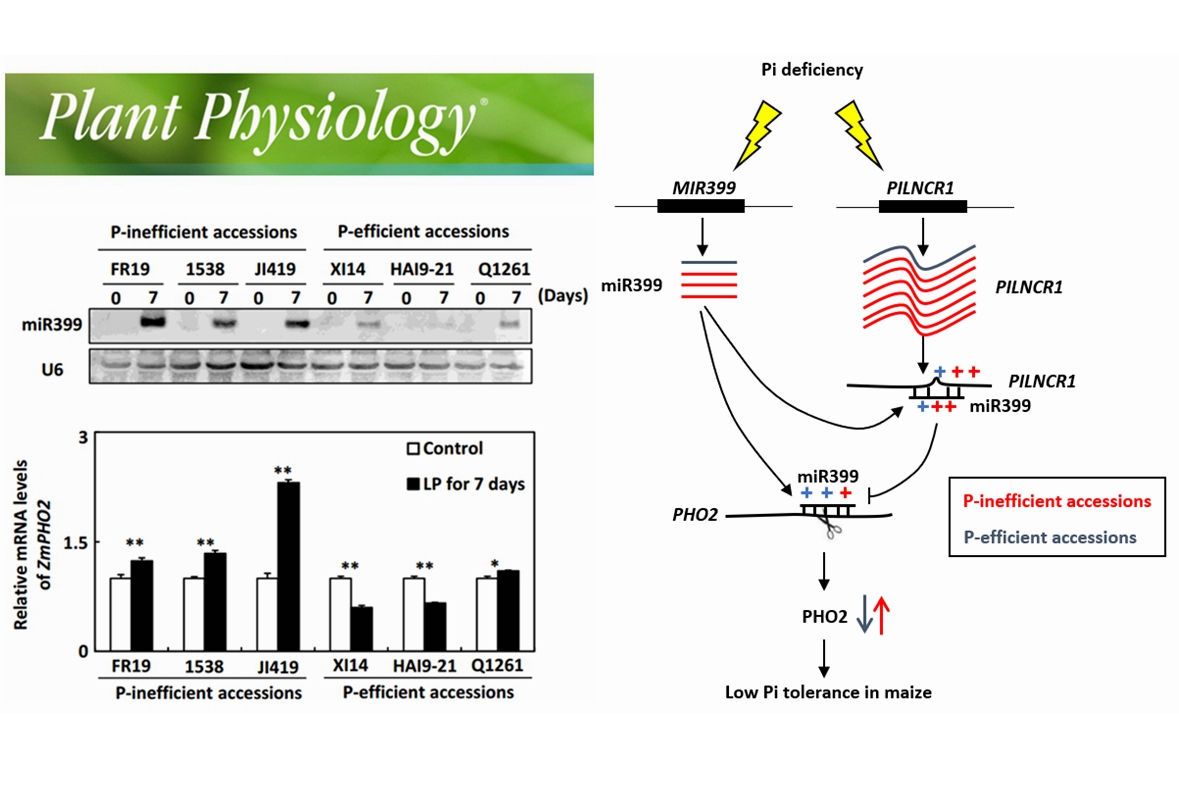 本研究发现在玉米中miR399特异性受低磷胁迫诱导上调表达;同时在miR399过表达的转基因玉米植株中磷由根部向地上部转运增多,导致转基因植株的成熟叶片边缘出现干枯坏死的磷中毒表型,表明miR399对于玉米体内磷稳态平衡具有重要作用。研究人员通过实验证实玉米中 PHO2 是miR399的靶基因,并对其进行重新注释,表明miR399-PHO2调控通路在玉米、拟南芥、水稻中是保守的。研究还发现玉米中miR399介导的 PHO2 转录后水平的切割主要出现在磷高效玉米自交系中。同时研究人员发现了一种长链非编码RNA—— PILNCR1 可与 PHO2 竞争性结合miR399,削弱了miR399对靶基因 PHO2 的剪切;并且在低磷胁迫条件下,磷低效玉米自交系中 PILNCR1 和miR399的表达丰度显著高于与磷高效玉米自交系,高表达量的 PILNCR1 会结合较多的miR399,从而导致靶基因 PHO2 上调表达,表明 PILNCR1 和miR399的表达量与玉米耐受低磷胁迫的能力相关。该研究揭示了 PILNCR1- miR399互作及miR399-PHO2调控通路在不同磷利用效率玉米自交系中具有不同的作用方式,这对于培育磷高效玉米品种具有重要意义。
