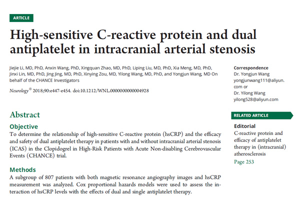 2018年2月,首都医科大学附属北京天坛医院王拥军教授团队在Neurology(IF:8.463)上发表封面论文,题目为"High-sensitive C-reactive protein and dual antiplatelet in intracranial arterial stenosis"。该研究利用CHANCE研究的影像和分子生物学数据,评价了在伴颅内动脉狭窄(ICAS)的轻型卒中或短暂性脑缺血发作(TIA)患者中,超敏C反应蛋白(hsCRP)与氯吡格雷联合阿司匹林抗血小板治疗的疗效与安全性之间的关系。附属北京天坛医院黎洁洁主治医师为第一作者,附属北京天坛医院王拥军教授和王伊龙教授为共同通讯作者。