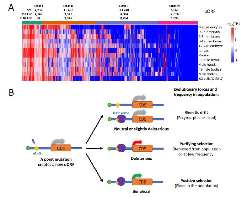 (A) 果蝇基因组中所有uORF在不同发育阶段的翻译效率;(B) uORF的演化模型。