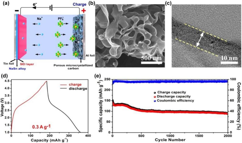 (a)基于多孔微晶碳的双离子电池结构示意图;(b)多孔微晶碳的扫描电镜图;(c)多孔微晶碳的透射电镜图;(d)电流密度0.3 A g-1下的充放电曲线;(e)基于多孔微晶碳的钠双离子电池的循环性能曲线(电流密度1 A g-1)。