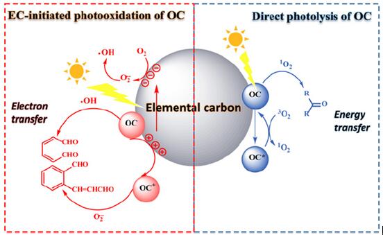 黑碳(Soot)是由生物质燃料和化石燃料不完全燃烧产生的一种碳颗粒物种,是大气气溶胶的重要组成成分,对全球气候变化具有重要影响。黑碳对可见光和红外光具有强烈吸收,这些吸收能够引发黑碳自身的光化学反应、促进其老化,从而影响大气环境。因此,光化学老化作为黑碳老化的重要途径而受到关注。 在国家自然科学基金委、科技部和中国科学院的大力支持下,中科院化学所光化学院重点实验室科研人员近年来在黑碳的光化学老化机制方面开展了深入研究。黑碳主要由元素碳(碳骨架)和有机碳(有机物)组成。以前的研究认为,黑碳的光化学老化主要是由其有机碳部分吸收太阳光、发生光化学氧化所致,其中对太阳光具有强烈吸收作用的元素碳部分则被认为是光化学惰性的。他们利用黑碳中元素碳和有机碳对红光和蓝光的不同吸光特性,研究了红光(l = 648 nm)和蓝光(l = 440 nm)两种波长光照射下黑碳的光化学老化,从实验上直接证明了元素碳可以吸光而引发有机碳的光化学反应。进一步研究还表明由元素碳吸光所导致的有机碳光化学反应和由有机碳本身吸光所引起的老化在产物和机理上有着本质区别:前者主要通过电子转移生成不饱和醛酮;后者则主要通过能量转移生成饱和醛酮。 这一研究揭示了元素碳吸光引发有机碳的光化学反应对黑碳的光化学老化起着非常重要的作用。首先,元素碳将黑碳发生光化学老化的有效光谱拓展到了红光区域。红光在太阳光谱中占有很大的比例,特别是在多云天气或太阳天顶角较小时,元素碳吸光将在黑碳光化学老化中起着决定性作用。其次,元素碳的光化学活性对大气气体在黑碳表面的持续性摄取产生显著影响, 可以起到类似催化剂的作用。论文发表于PNAS, 2018, 115, 7717 。 图1 元素碳参与下有机碳光化学反应机理与有机碳自身光解反应机理 光化学院重点实验室 2018年12月7日 |