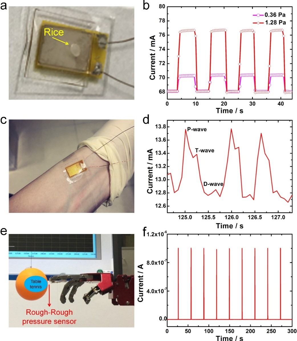 图2. “粗糙-粗糙”型传感器应用:(a-b)传感器用于检测微弱压力(米粒),检测极限可以达到0.36 Pa (c-d) 传感器用于健康监控:实时监测人体脉搏(e-f)传感器用于智能机器人:实时监测悬挂乒乓球的轻微摆动