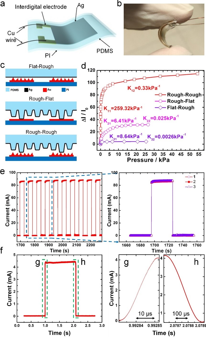 图1. 微结构压力传感器传感特性:(a-b)制备的压力传感器具备良好的机械柔韧性 (c-d)不同微结构的压力传感器传感特性,其中“粗糙-粗糙”型传感器具备超高的灵敏度及最宽的动态范围(e)“粗糙-粗糙”型压力传感器具备良好的稳定性(f)“粗糙-粗糙”型压力传感器的响应和恢复时间