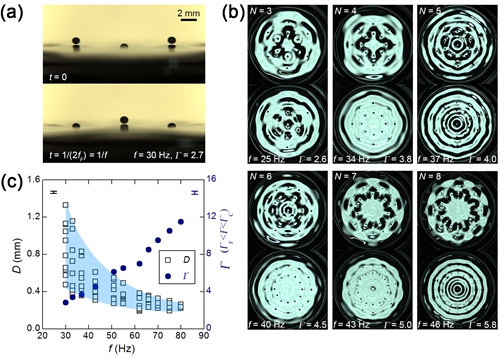 图2. (a) 悬浮液态金属液滴的侧视图;(b) 多个液态金属液滴自组装为对应的表面波图案(N=3-8);(c) 不同驱动频率下能够悬浮的液滴直径范围(蓝色区域)