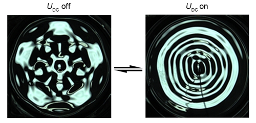 不同于传统非导电流体的是,液态金属得益于自身金属材料优良的导电性,使其能够通过外加电场来灵活改变自身性质。作者们由此提出了一种通过外加电场灵活快速调控液态金属表面波状态的方法(图3)。分析液态金属的电毛细曲线发现,只需一个很小的外加电压(5 V以下),即能迅速使液态金属的表面张力发生显著改变,而流体表面张力对于法拉第波临界值影响极大,进而决定表面波模态。值得注意的是,通过外加电场调节表面波模态是一个可逆的过程,当撤去外加电场后,表面波能够自动恢复到其自身原本的状态。因而对于液态金属这一特殊流体,利用外加电场来灵活切换表面波状态使其具有更高的可控性,对于研究法拉第波不稳定性、模态形成和模态间转换问题等具有重要的意义。