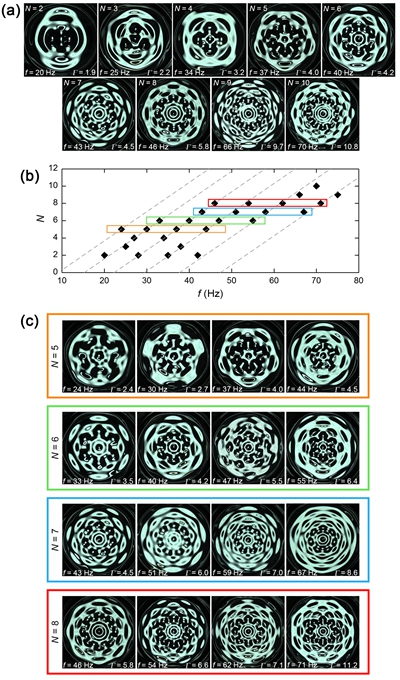 图1. (a) 高度对称的规则表面波图案,折叠对称数N从2到10;(b) 不同驱动频率下的表面波图案形状汇总;(c) 四组具有相同对称折叠数的表面波图案,N分别对应于5-8