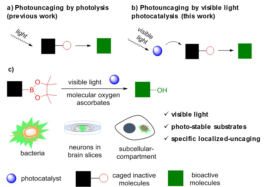 图一:活细胞内的光催化生物相容反应用于生物活性分子的可见光释放