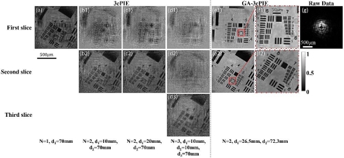 在第三篇题为“Three-dimensional space optimization for near-field ptychography”的文章中,实现了近场叠层成像术的三维空间优化。叠层成像术(Ptychography)是一种无透镜的相干衍射成像技术,拥有大视场、高分辨和定量相位的优势。通过记录多幅交叠的衍射图像,利用交叠区域的数据冗余和先进的相位恢复算法,能恢复出物体的透射率函数分布、分解相干态以及校准系统误差。这一无透镜的成像方法已经成功应用于可见光、电子波段和X射线波段。然而,叠层成像术在实际应用过程中依然存在一些限制,比如在针对三维厚样品成像时,其厚度是未知的,传统成像方法是尽可能减小对样品每一层的成像厚度,这就增加了成像的层数,而且该方法只适用于连续样品,对于离散的有着非均匀空间分布的样品则可能会出现伪影,额外的空白层也会降低图像质量。