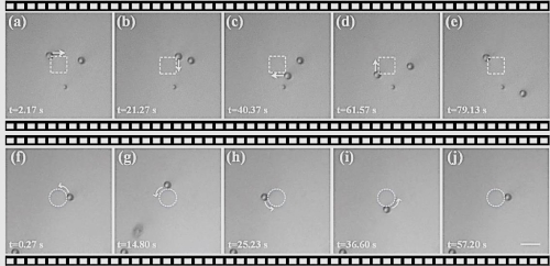 图3.激光透过散射介质后对微粒的捕获和操纵实验结果。(a)-(e)散射介质后操纵微粒沿矩形轨迹运动;(f)-(j)散射介质后操纵微粒沿圆形轨迹运动(标尺:10μm)