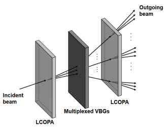 非机械光束偏转技术广泛应用于激光雷达、自由空间光通信、高能激光系统等领域。大角度空域扫描在微波频段容易实现,而在近红外光波段,由于受到工艺水平及物理极限的限制,目前使用的单一器件如液晶光学相控阵(LCOPA)或者液晶偏振光栅等只能在小角度范围内连续偏转。为了实现高能激光系统中的空间大角度光束连续偏转,目前已有的一种方案是双LCOPA加体布拉格光栅的方法:第一层LCOPA通过对激光光束的小角度转向实现对全息光栅的照射部位选择,然后利用体布拉格光栅(VBG)实现激光光束的离散大角度偏转,最后利用LCOPA实现对出射光束偏转角度的精确控制和填充。目前,国际上关于VBG作为角放大器的研究除几项专利技术外,深入系统的理论研究和实验上的实现尚未见报道。