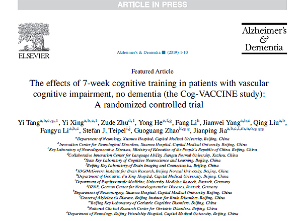2019年3月,宣武医院贾建平教授团队在《Alzheimer's & Dementia》(5年IF:12.06)上在线发表题为“The effects of 7-week cognitive training in patients with vascular cognitive impairment, no dementia (the Cog-VACCINE study): A randomized controlled trial”的论文。研究团队通过随机对照试验,证实认知训练可有效改善血管性轻度认知障碍(vascular cognitive impairment no dementia, VCIND)患者的认知功能。宣武医院唐毅副教授、邢怡主治医师、江苏师范大学朱祖德教授为共同第一作者,宣武医院唐毅副教授、赵国光教授、贾建平教授为共同通讯作者。