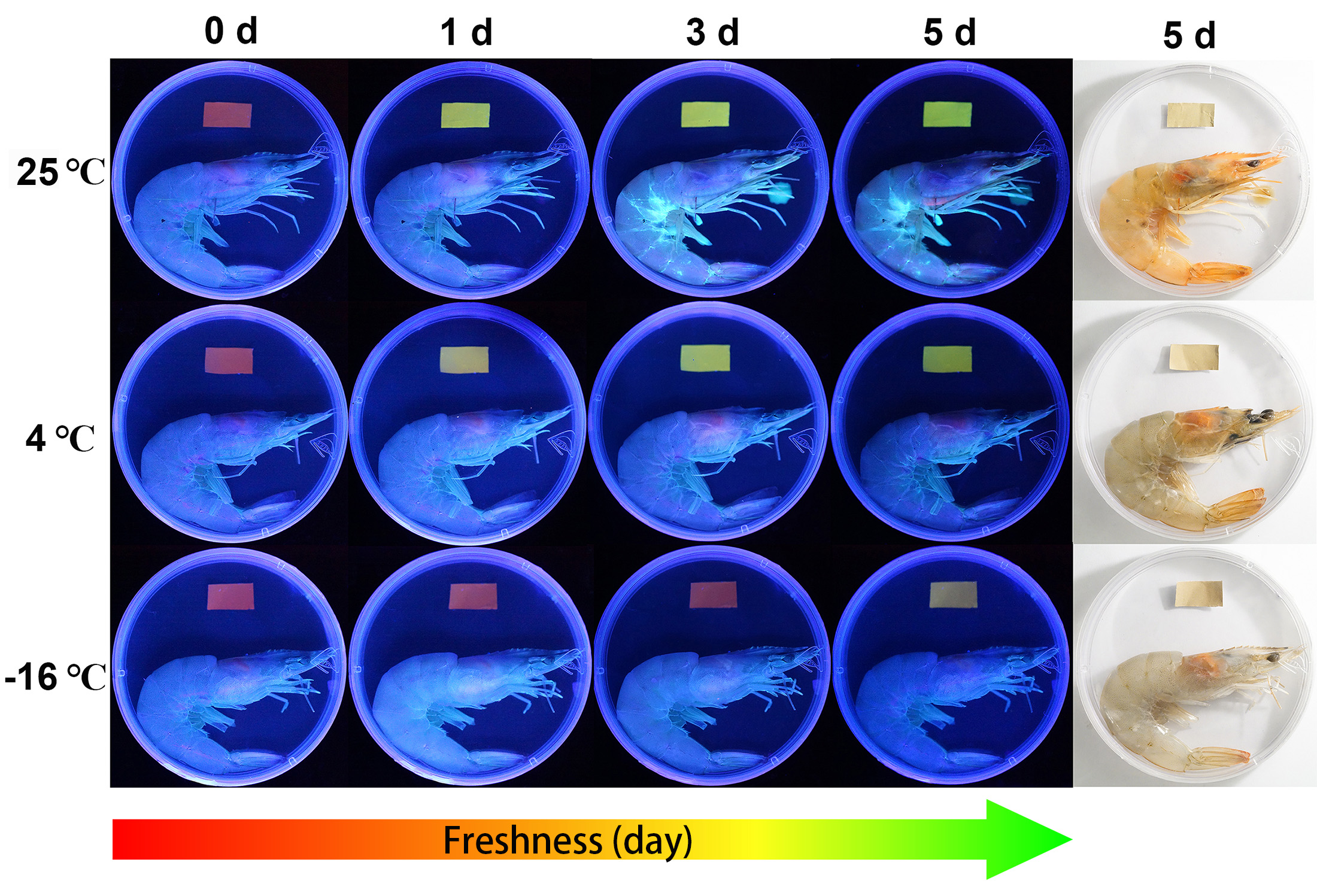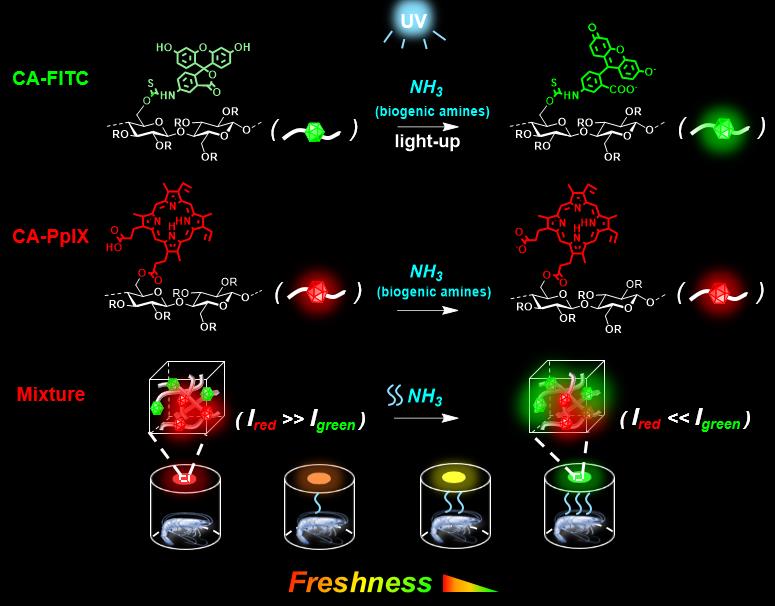 最近,他们设计并合成了新型比率型胺响应的纤维素基荧光材料,并基于此提出了可视化监测海鲜食品新鲜度变化的方法。其中,将作为指示剂的异硫氰酸酯荧光素(FITC)及作为内标物的原卟啉分子(PpIX)分别通过共价键分别键连到醋酸纤维素(CA)分子链上。将所得到的CA-FITC与CA-PpIX简单按比例混合,得到了初始荧光可调的固态荧光材料。其荧光发射强度比值IFITC/IPpIX与胺浓度(5-25000 ppm)的对数呈线性关系,同时材料荧光由红色向绿色渐变,实现了快速、准确、实时地对环境中胺浓度进行可视化监测的目的。这种新型纤维素基荧光材料制备简单,具有良好的稳定性、可逆响应性、生物降解性和加工性能,可制备成多种材料形式,例如:油墨、涂层、透明柔性薄膜和纳米纤维薄膜等。将这种比率型胺响应纤维素基荧光材料的纳米纤维薄膜作成指示标签,成功实现了海鲜食品(如海虾)新鲜度原位可视化监测。该研究成果近日发表于Nature Communications(2019, 10, 795)上。