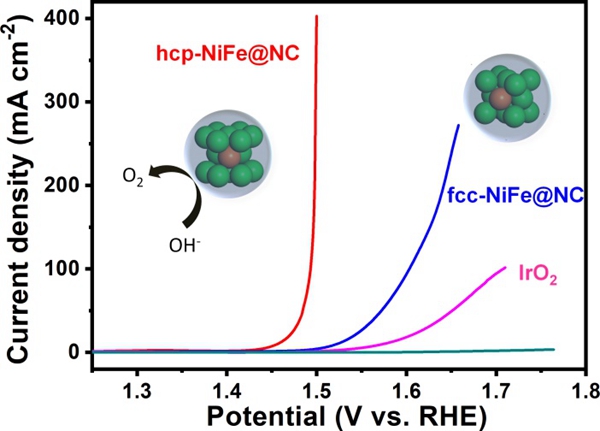 图1. 不同晶体结构NiFe合金与贵金属基催化剂的析氧反应极化曲线对比。 |