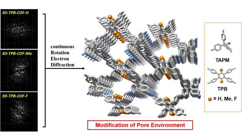 研究表明,3D-TPB-COFs均具有非常好的结晶性,SEM显示颗粒大小约为1微米。利用cRED技术,他们成功解析了三种COFs各自的晶体结构(五层嵌套的pts拓扑结构)。需强调的是,通过cRED测得的数据分辨率能够达到0.9-1.0 Å,可精确定位COFs中所有非氢原子的位置。另外,通过引入不同官能团可精确控制3D-TPB-COFs孔道环境,其在CO2/N2选择性吸附过程中表现出不同的吸附性能。该工作不仅有助于更好地理解和设计用于目标应用的3D COFs的孔道环境,而且可直接在原子水平上研究多晶COF样品,从而避免极具挑战的生长COF单晶过程。