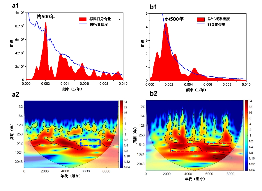 另一组是利用考古遗址碳十四测年数据概率密度方法,以高精度年龄框架重建史前人口变化记录的优势,全面系统获取了我国东北和华北北部627个考古遗址碳十四测年数据,在排除大误差样品和其他无法反映人类活动的材料数据之后,进一步通过卡方检验进行数据合并,减少遗址间或同一遗址不同时期人为采样的偏差,利用国际通用计算方法和希尔伯特黄变换(Hilbert-Huang Transform),获得从8000年到2000年期间反映人类活动强度的碳十四概率密度曲线。结果表明,人类活动强度高峰值,先后出现在~7570、~6770、~6240、~5440、~4930、~4420、~3820、~3300、~2800 cal yr B.P.。谱分析和小波分析结果表明人类活动强度具有~500年主导周期 (图3 b1、图3b2)。