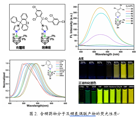 通过同位素标记实验,观测到C2B3开口平面上消失的桥氢信号重新出现在硼氮偶联产物中,表明此反应可能经历了一个与文献报道不同的反应过程。通过DFT理论计算,我们推测该硼氮氧化偶联反应的具体过程如下:巢式碳硼烷阴离子首先与一分子DDQ发生单电子转移(SET)反应,生成带一个电子的巢式碳硼烷中间体I。接着中间体I再与另一分子DDQ发生氢转移(HAT)反应,电正性的桥氢与DDQ生成[HDDQ]·−的同时,中间体I生成电中性的中间体II。伴随氮原子对中间体II的亲核进攻,9位硼原子上的氢原子迁移至剩余的两个硼原子中间形成新的桥氢。通过实验和理论计算我们还证明了当巢式碳硼烷碳位点含不等价取代基时,氮原子会选择性亲核进攻位阻较小的硼原子。在探索硼氮偶联产物性质的过程中,我们发现分子内产物的电子可以通过硼氮键在σ芳香性的巢式碳硼烷和π芳香性的喹啉环间传递,以及分子间产物2n和3i分别具有聚集诱导发光(AIE)和正溶剂化显色性质。此外,利用该方法可以以优良的收率一步得到巢式碳硼烷修饰的含芳香氮杂环的药物分子,这为设计新型的含硼药物分子及材料分子提供了方法和思路。