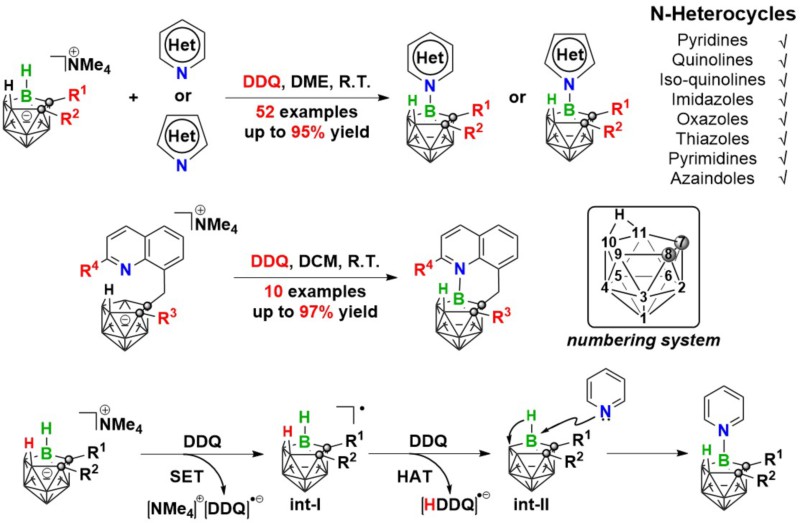 与闭式碳硼烷表现的拉电子性相反,负一价巢式碳硼烷阴离子表现出一定的给电子性,其中敞开的C2B3平面上10号位硼原子的给电子性最为明显。目前7, 8–二碳–巢式碳硼烷B-H键的修饰方法可以归纳为亲电取代反应、氧化取代反应以及亲电诱导的亲核取代反应三种类型,但上述方法存在着如修饰基团受限、易生成金属碳硼烷副产物等缺陷。燕红课题组利用有机氧化剂(2, 3–二氯–5, 6–二氰对苯醌(DDQ)),成功实现了7, 8–二碳–巢式碳硼烷9位B-H键的功能化,以高收率得到了一系列分子内或分子间硼氮氧化偶联产物。该方法具有无需金属、底物适用范围广、官能团兼容性好、反应速率快、原子经济性高等优点。