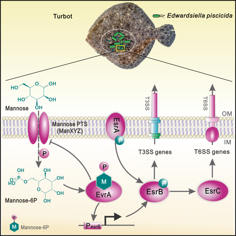 糖代谢是为生物体生长提供能量的基础代谢之一。病原菌往往一方面利用糖代谢生产ATP,促进生长繁殖;另一方面利用糖代谢过程产生的代谢物作为信号分子,调控代谢过程和毒力系统表达,从而促进感染过程。从杀鱼爱德华氏菌野生毒株出发,本论文首先利用mariner家族转座子构建了一个插入位点确定的杀鱼爱德华氏菌突变株文库(Defined transposon insertion mutant library)。利用该文库和转座子插入测序技术在不同培养基、巨噬细胞以及大菱鲆条件下对生长/定植相关的条件必需基因进行系统筛选,发现在该菌中甘露糖代谢显著影响其在鱼体内的定植。研究人员进一步研究发现,爱德华氏菌通过其编码的甘露糖PTS (磷酸烯醇式丙酮酸转移酶)系统,感知环境中存在的甘露糖,并将其磷酸化生成甘露糖-6磷酸,并转运至胞内(图1)。体内的一种新型转录调控因子EvrA能直接与甘露糖-6磷酸结合并受其调控,增强与DNA结合能力,激活由EsrB和EsrC介导的三型分泌系统(T3SS)和六型分泌系统(T6SS)的表达,进而调控杀鱼爱德华氏菌在宿主体内的定植过程,并造成系统性感染(图1)。该研究首次报道了病原菌通过感知环境中的甘露糖调控毒力系统表达,为水产养殖病害防控技术开发提供理论指导。