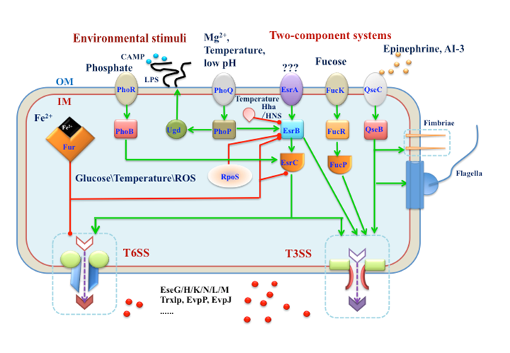 图2:杀鱼爱德华氏菌感知环境变化并调控毒力表达和效应分子分泌示意图