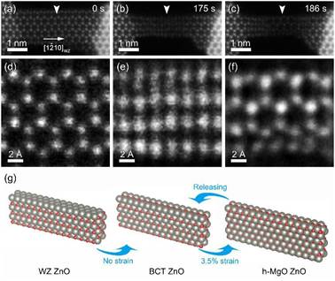 ZnO纳米线中可逆结构相变过程的实验测定(a-f)和第一性原理计算(g)