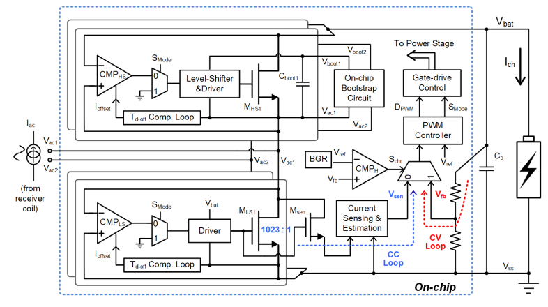 近日,中国科大国家示范性微电子学院程林教授联合香港科技大学暨永雄教授课题组在无线充电芯片设计领域取得重要成果。研究者提出了一种用于谐振无线功率传输的新型无线充电芯片架构。所提出的架构通过在单个功率级中实现整流、稳压和恒流-恒压充电而实现了高效率和低成本,为今后无线充电芯片的设计提供一个高效的解决方案。该研究成果近日以“A 6.78-MHz Single-Stage Wireless Charger With Constant-Current Constant-Voltage Charging Technique”为题发表于集成电路设计领域著名期刊《IEEE Journal of Solid-State Circuits》上( JSSC, 2020, DOI:10.1109/JSSC.2019.2961852)。