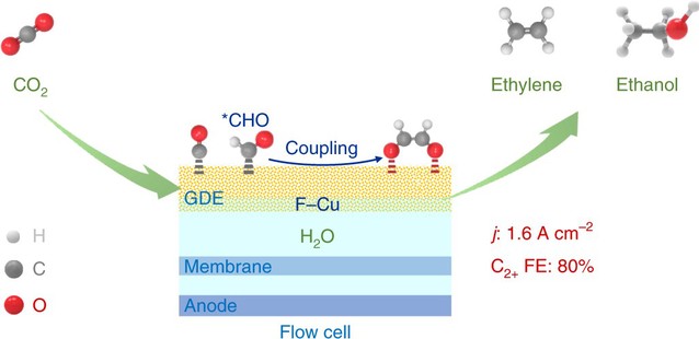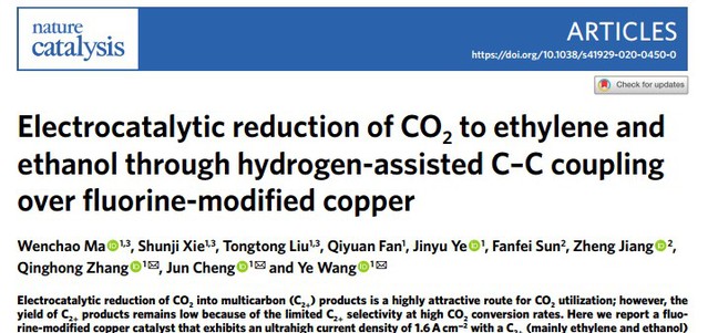化学化工学院王野课题组与程俊课题组合作,在CO2电催化还原制乙烯和乙醇方面取得重要突破,相关成果“Electrocatalytic reduction of CO2 to ethylene and ethanol through hydrogen-assisted C-C coupling over fluorine-modified copper”发表于Nature Catalysis (Nat. Catal., 2020, DOI:10.1038/s41929-020-0450-0)。