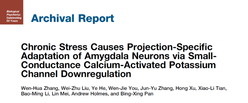 据悉,这是潘秉兴教授团队近年来围绕“慢性应激致过度焦虑的杏仁核机制”研究中所取得的重要成果之一。2019年,他们团队在精神病学知名刊物Biological Psychiatry连续发表两篇研究论文,对慢性应激重塑杏仁核神经元结构与功能的环路机制进行了深入研究。结果发现,慢性应激特异性下调了BLA内投射至腹侧海马区神经元的小电导钙依赖钾通道(SKCa)功能,引起BLA-vHPC环路过度激活,进而增加了小鼠的焦虑样行为(Biological Psychiatry, 2019, 85:812-828;张文华副研究员为论文第一作者,潘秉兴教授为通讯作者)。