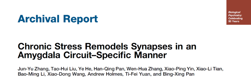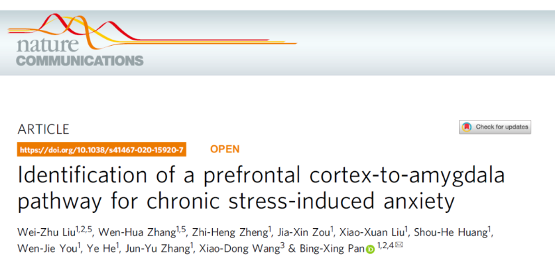 2020年5月6日,南昌大学生命科学研究院潘秉兴教授课题组(博士研究生刘伟柱和张文华副研究员为论文共同第一作者,潘秉兴教授为通讯作者)在Nature Communications上发表了题为 Identification of a prefrontal cortex-to-amygdala pathway for chronic stress-induced anxiety的研究论文,报道了慢性应激暴露通过选择性调控前额叶皮层对杏仁核特定类群神经元的支配,并最终引起过度焦虑。