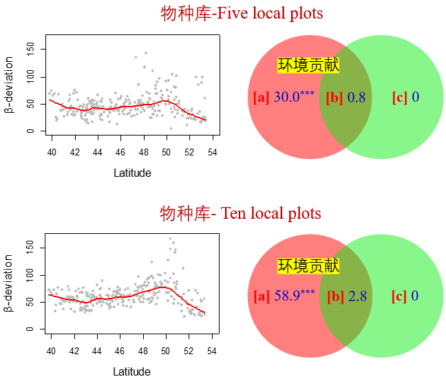 团队通过研究,为东北森林生物多样性纬向梯度格局提供了机制性的解释。研究区横跨暖温带、中温带及寒温带,不同气候带之间的生态过渡区通常具有较大的环境变异性,从而导致较高的物种周转率。该研究检验了两个与北部温带森林区域有关的假设:β多样性响应于不同生态区之间的环境异质性而具有非单调纬向变化;生境过滤对β梯度的作用效应受区域物种库大小的影响。研究发现β偏差随纬度梯度表现出非单调变化模式,在50°N附近出现峰值,反映出树种的组成及分布在中温带与寒温带之间的过渡与转变;之后由于环境异质性的降低,在寒温带随纬度的增加迅速下降,支持了第一个假设。β偏差的非单调纬向格局主要受东北地区年降水、降水季节性及最干旱季降水控制,因此环境过滤是β梯度的重要驱动力。环境贡献大小对区域物种库具有明显的依赖性,环境对β偏差的影响随着区域物种库的增大而增大,支持了第二个假设。