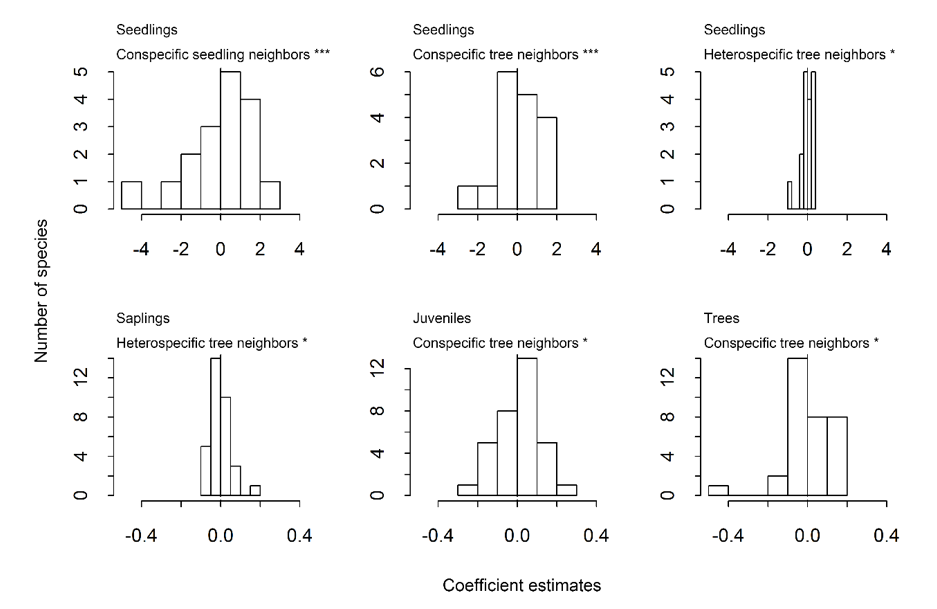 另外,团队通过分析和研究,为物种共存及群落构建机制研究提供了新的思路。SCIENCE杂志在创刊125周年之际,公布了125个最具挑战性的科学问题,其中“物种的多样性是由什么决定的”位列前25个被认为最重要的问题之一,凸显了破解物种多样性形成与维持机制的重要性与紧迫性。该研究以团队位于吉林蛟河的42公顷大样地复测数据、836个幼苗样方连续5年的动态监测数据为基础,阐明了生态位分化和负密度制约是影响东北针阔混交林树木存活的关键机制,值得关注的是二者的相对重要性在不同生活史阶段表现也不尽相同。