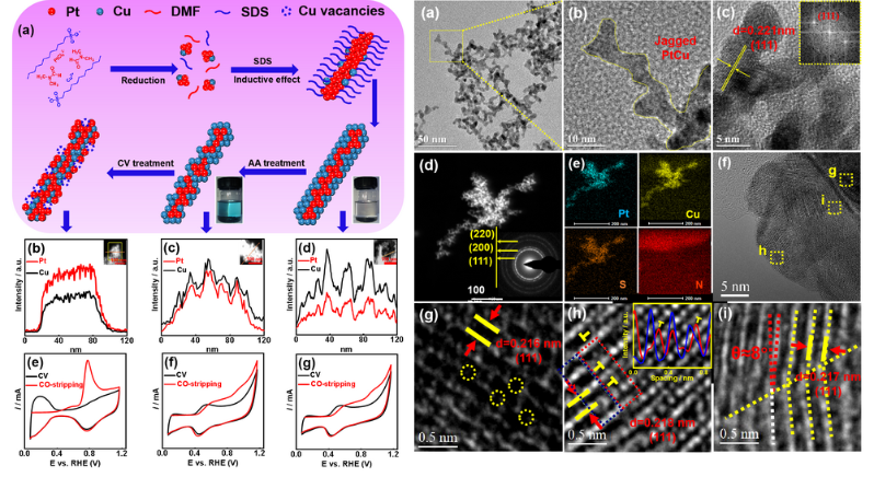 有鉴于此,王勤教授课题组在前期研究工作的基础上(Adv. Energy Mater,2018, 8, 1800980; Chem Comm, 2020,CC-COM-12-2019-009481.R1; Chem Comm, 2020, CC-COM-12-2019-009684.R1; Applied Surface Science, 2020, 508, 145302; Applied Surface Science, 2020, 500, 144052),首次提出了电化学刻蚀组装富含金属空位缺陷的高效电催化材料的合成策略,合成了具有超细尺寸,自支撑结构和富含铜空位缺陷的超稳态三维PtCu纳米线。该材料具有优异的氧还原反应催化性能,其质量活性是商用Pt/C催化剂的14.1倍,是美国能源部2020年发展目标的7.2倍,也是目前报道的性能最优的自支撑贵金属催化材料。密度泛函理论计算结果表明,Cu空位的引入增强了Pt原子对HO*中间体的吸附,同时减弱了对O*中间体的吸附。该研究为在电化学活化过程中活性位点的调控以及金属空位缺陷、晶格应力的研究提供了重要的研究思路。